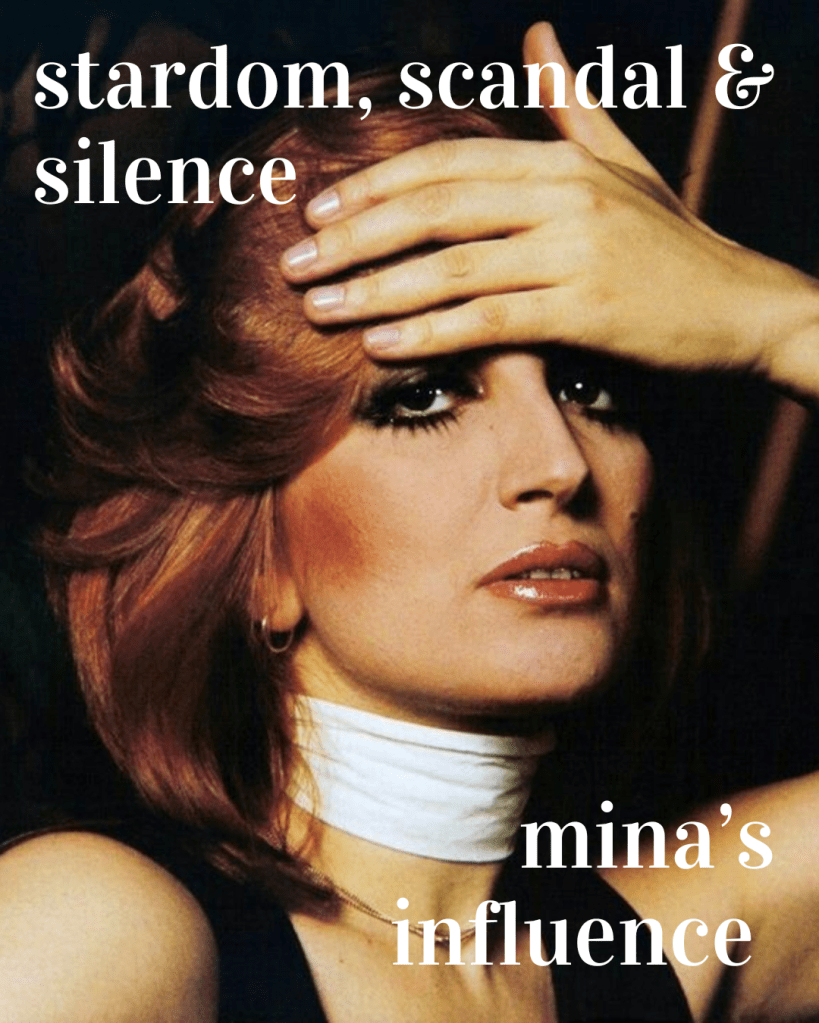 Mina was a feminist long before feminism became a mainstream conversation in the predominantly Catholic country. She was building a career on her own terms and living a fully, unapologetic life in a society that often passed judgement onto her.